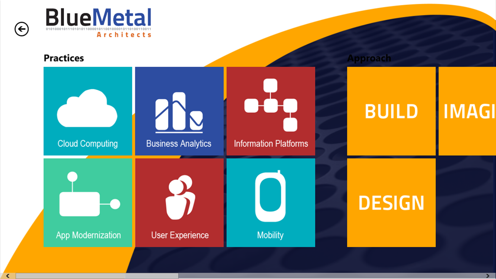 Below are some screens shots from one of my demo applications. As you can see I was able to follow the Metro guidelines while allowing my company’s brand shine through. Windows 8 makes it easy to implement a Metro design. There are built in styles and animations that helps in following the Metro guidelines.