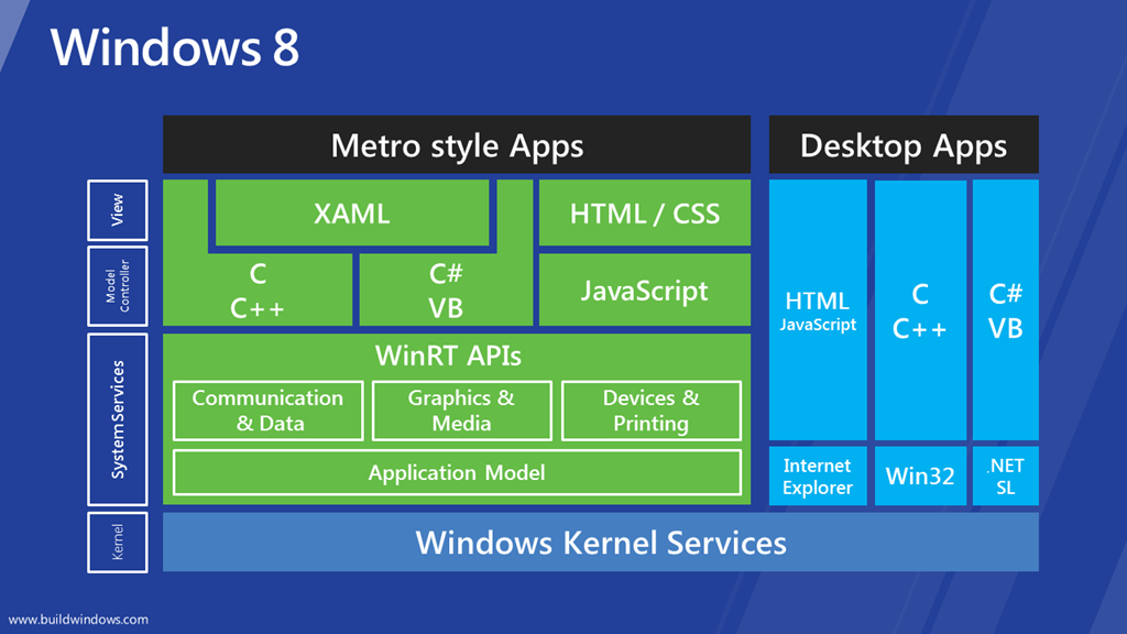 With this architecture, Microsoft open windows application development to a whole new group of people, HTML/Javascript developers. These developers can develop the same rich applications as the XAML developers, using the same WinRT API. This architecture also keeps C#/VB XAML developers in the loop but brings also brings C/C++ into modern times by allowing them to develop rich user experiences. At the same time legacy applications will still run in desktop “mode”.
