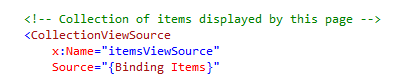 This is implemented as an ObservableDictionary. This view model is set to the pages DataContext in the constructor.