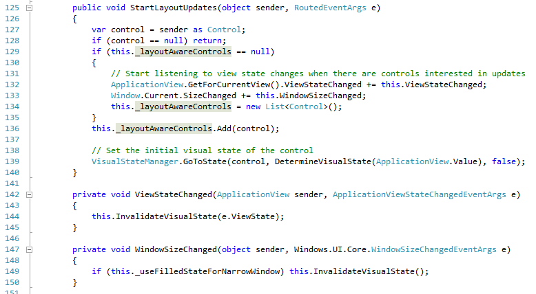 One of the sensors that most tablets have is an accelerometer. This allows user to orient their tablets in any orientation they want. Also Metro apps can be snapped side by side with another Metro application. Developers have to handle these changes. In the Developer Preview each page subscribed, in the code behind, to the orientation event that gets fired. This functionality has been abstracted into the LayoutAwarePage class. This makes sense since this class is named LayoutAwarePage. Here are some of the methods that handle that: