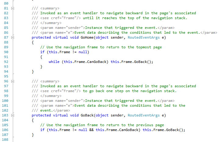 One of the complaints I had with the Developer Preview is that there was no easy way to navigate from page to page. There was also no means to capture page history. Hitting the back buttons on a page created by the templates did not necessarily do what the user thought it would. It may or may not navigate to the last page the user visited. Of course you could override that behavior but it required build a custom navigation framework. This is now taken care of in this new class. Here are the convenience methods that handle that for you.