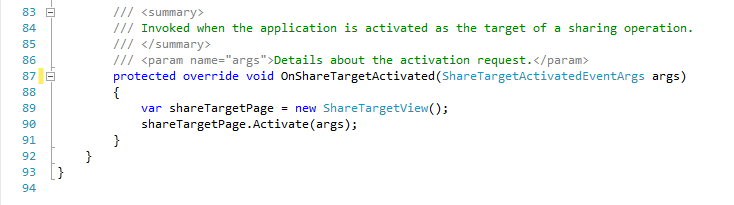Next the App.xaml.cs file must be modified to handle being activated by the Share Broker. To do that add the following code: