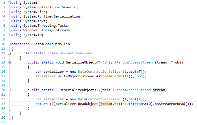 It took some trial an error to determine how my custom object back and forth.  I finally realized that it needed to be serialized so that it can passed between the two applications. Come to find out the DataPackage needs objects to be serialized into an IRandomAccessStream.  After figuring this out I decided to create a couple of extension methods to help with this process.  Here is the code for the extension methods: