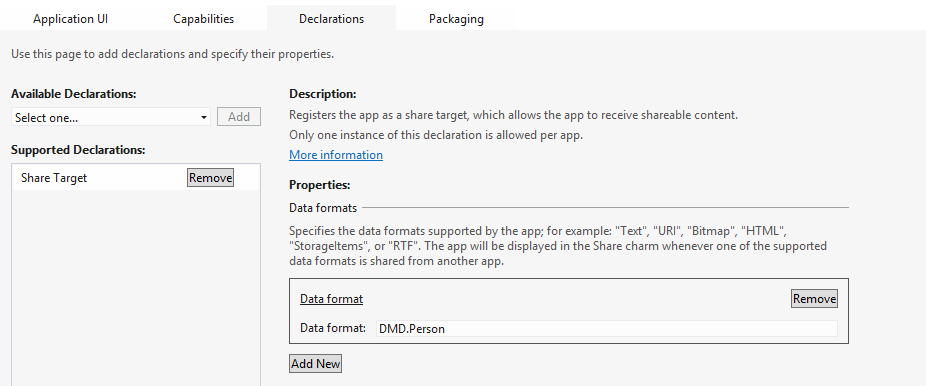 Once the user selects your application the data package is passed.  Your Target must handle this package. There is a little more work that needs to be done with the Target application.  First the Target application must declare that they are a Share Target.  This is done in the application manifest. Note that the Data format field must match the data type declared in the source application.