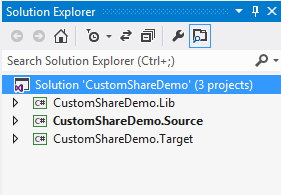 Solution ExplorerWhat happens if you control both the Source and the Target applications? They could be a part of a bigger enterprise system.  Can I share data, locally, between the two?  One of the acceptable data types for the package is something called Custom Data Format.  I interpret this to mean I can pass my business objects between the two applications. So I set out to try this.  I started by creating a Source and Target application, and a class library to hold my object model.  I added a reference to the class library in the Source and Target applications.