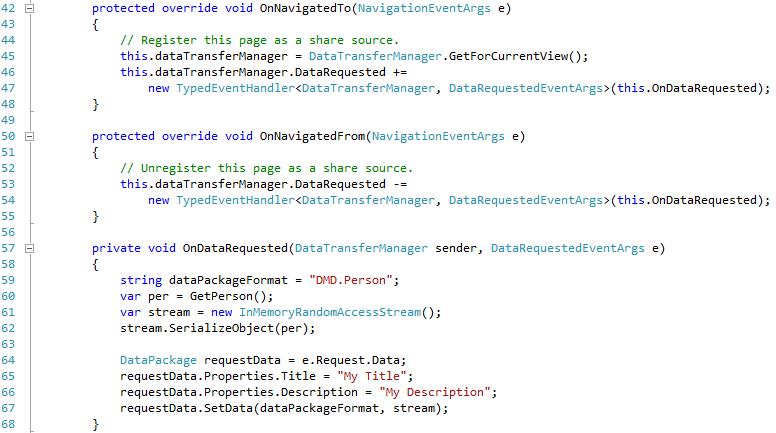 • Line 64: the data package is retrieved from the DataRequestedEventArgs