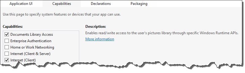 As another security precaution Metro application can only write out files for which it has a file type association. If you do try to write out to the folder without the type association you will get a security exception stating you don’t have permission to that folder. This prevents your from access files that the user has not given you permission to access. In the first part of this series I created an association to a type that is user to launch the app. I did not want to reuse that type association so I added a second on to the declarations in the application manifest.