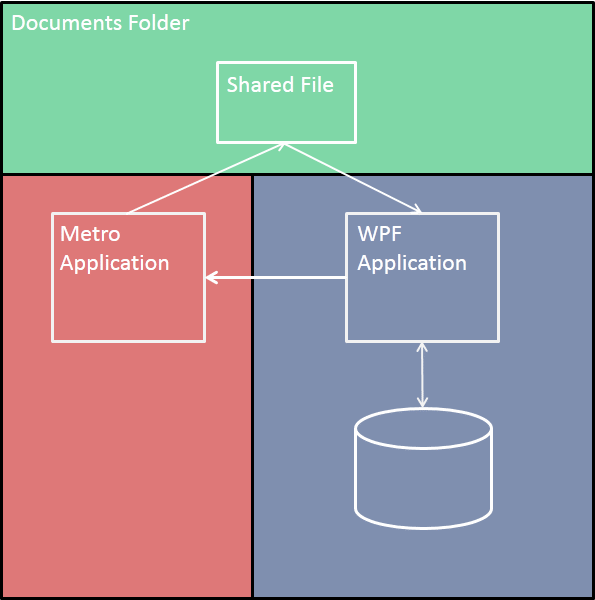 In the Metro world applications run in a strict sandbox and have no access to the world outside except in certain situations. With the user’s permission, Metro applications can access the library folders on the system. These folders include the Documents folder, the Music folder, and the Picture folder. So following our map above I will have the Metro application save the changes to a file in the Documents folder. Then I will have the WPF application pick up that file and process the changes.