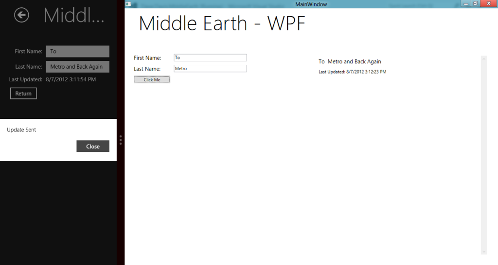 Here we can see the results. The Metro application is snapped and the WPF application is running filled. We can see that the data has made the round trip. Get the bytes and see for yourself.