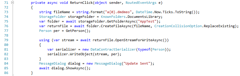 I start by creating a file name and in order to ensure I don’t overwrite a file that has not been processed I use the ticks from the DateTime object to ensure uniqueness (Line 73). Note the use of the new file type. Next I grab a reference to the DocumentsLibrary which is available through the KnownFolders object (Line 74). I then get a reference to the a subfolder (Line 75) where I create the file I am going to use (Line 76). In Line 79-83 I stream the serialized object out to the newly created file.