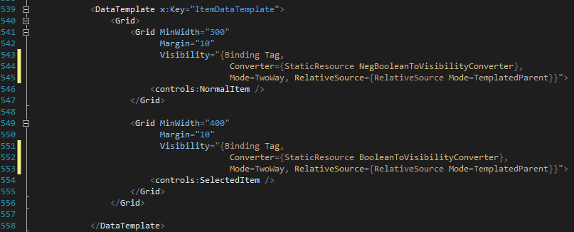 I then set up two grids in the DataTemplate to control the content that is visible based on the  IsSelected property.  I created two controls one for normal view and one for a selected view. Trough value converters I convert the value from the Tag into a visibility for the grid.