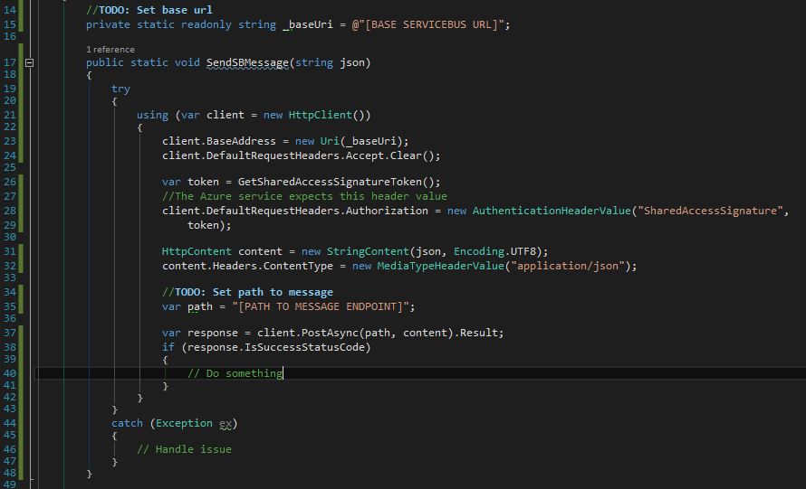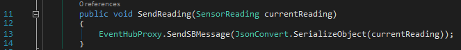 My Event Hub expects all messages to be formatted as JSON. My proxy method takes the serialized object and packages it up as the content of the HTTP request. It also sets the SharedAccessSignature header value.
