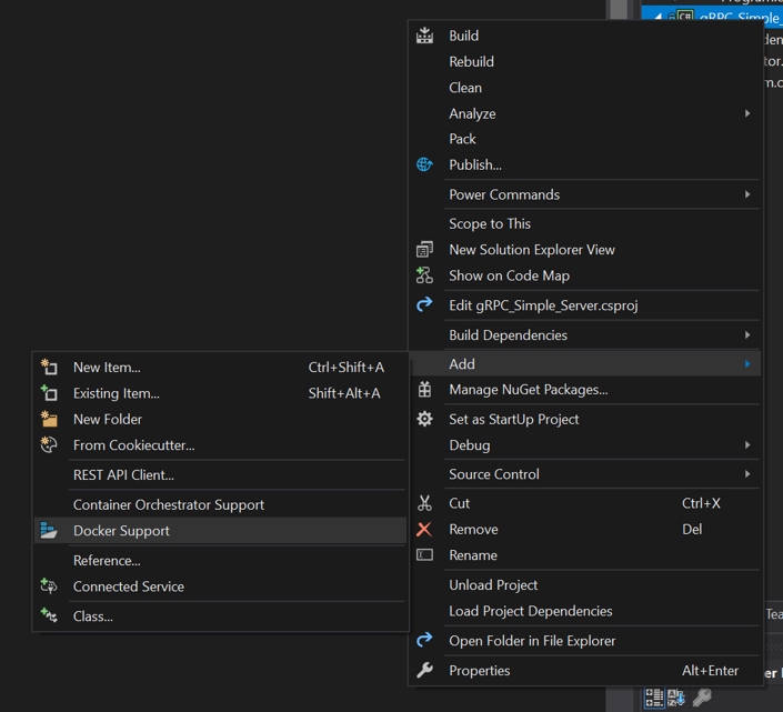 The first thing I did was add Docker support to the server project. There are many different ways to do this but since this isn’t a post on how to do Docker, I will do it the simplest way. I right clicked the project file and then click Add -> Docker support.