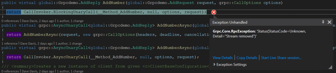 Why am I getting this exception? I did some Googling on Bing and figured out that I was setting my server ports incorrectly. When I setup the server I had it listening on 127.0.0.1:50051. Since my Client lives out side the container it could never reach that address. So I had to change it to listen on 0.0.0.0:50051.