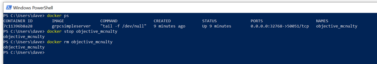 Let’s launch PowerShell and see what we have done. If you type: Docker ps You will see the containers that are running. You will notice that the port mapping is quite right. I want to map 50051 externally to 50051 internally I do that by stopping the container, removing the container and running the container with the port mappings I want.