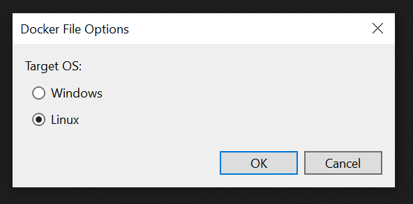 Since one of the benefits of Docker is portability, I decided to choose Linux on the Docker File Options dialog. I love seeing my .Net code running on Linux