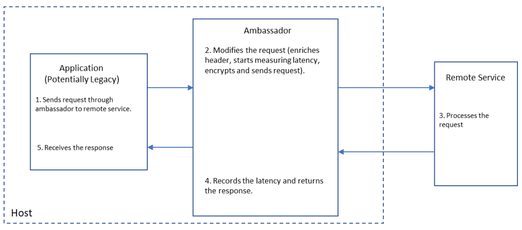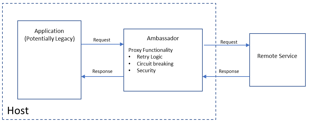 The Ambassador pattern is a helper service that sends network requests on behalf of other applications. It is typically used with legacy applications or applications that are hard to modify. You create an Ambassador when you need to add features like logging, connection configuration, metering , and monitoring to a legacy application. Think of it as an out of process proxy. It can also be helpful when features, like security, need to be maintained by a central group within an organization. Ambassadors can also be used to write common features that can be used across different languages or frameworks, so mixed-language environments. The Ambassador service is deployed with the application and acts as the proxy for service calls.