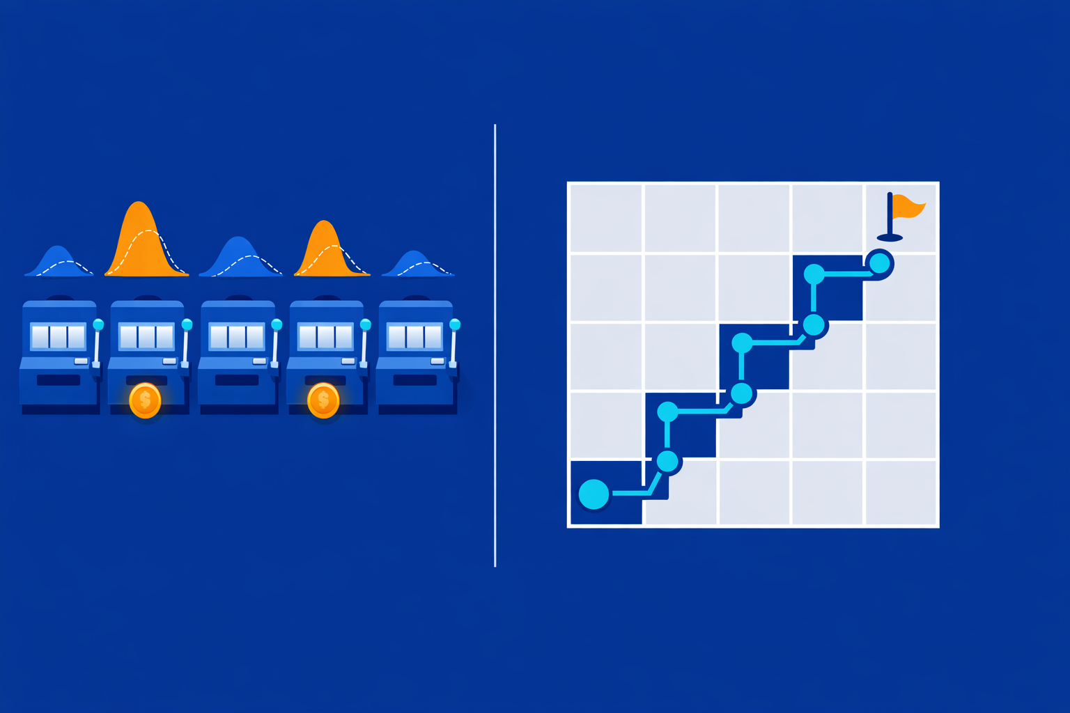 The multi-armed bandit is RL at its simplest: one state, multiple actions, uncertain rewards. Imagine a row of slot machines (bandits), each with a different hidden payout distribution. You can pull one lever per round. Which do you pull?