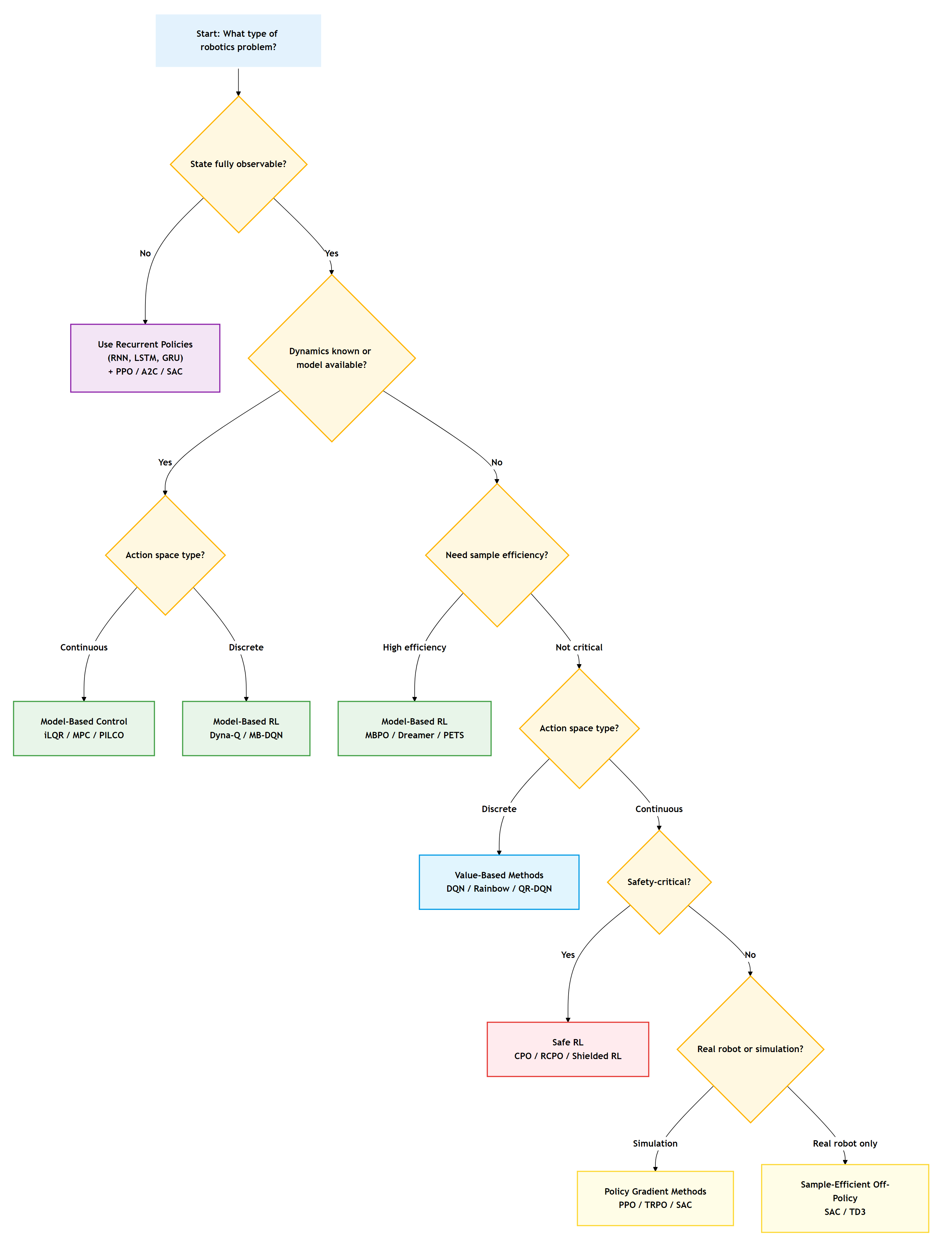 The decision diagram below is that tool. It works by asking questions about your robotics problem that you can actually answer: Can your sensors fully observe the state? Do you have a dynamics model? How many real-robot samples can you afford? Each branch leads you toward algorithm families suited to your constraints.